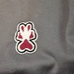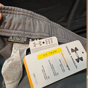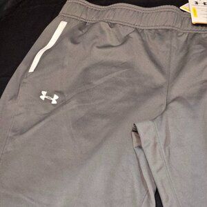 Brand new with tags! Under Armour Men’s 2XL track pants in gray with white stripe detailing and a bulldog mascot patch at the ankle.