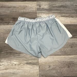 NWT Under Armour Play Up Side Stripe Slate Blue White Women 2X Plus Loose Shorts. Lightweight, 100% polyester, elastic waist, pockets, front logo, casual, athletic, sporty, running, jogging new with tags