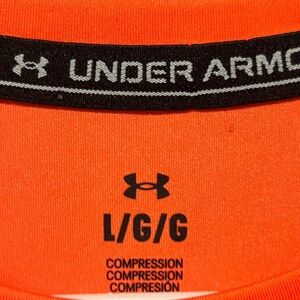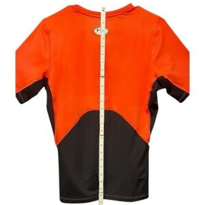 The image shows an orange and black Under Armour "RED" branded short-sleeve shirt with a tag, “RED" they don’t play like we do” is printed in a stylized font on the front of the shirt. The shirt appears to be a performance or athletic wear item, possibly part of Under Armour's HeatGear line, designed for keeping athletes cool and dry during workouts.