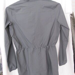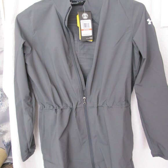 NWT - Women's Under Armour Jacket - Size XS. Dark gray coloring. Longer length with elastic gathered waist and full zip front. Lightweight water-resistant jacket.