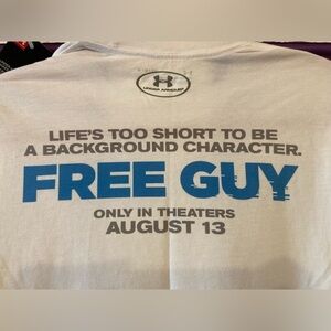 Gear up with this official Under Armour x Free Guy promotional t-shirt, celebrating the 2021 action-comedy starring Ryan Reynolds, Jodie Comer, Taika Waititi, and Joe Keery, directed by Shawn Levy. This exclusive item was given out at the New York premiere of the film, making it a rare collector’s piece! Featuring the movie’s tagline “Life’s too short to be a background character” on the back, this limited-edition tee was created for the film’s theatrical release on August 13, 2021.