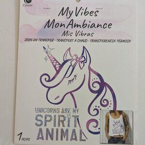 Cute, new with tags iron on tee shirt transfer which reads 'Unicorns Are My Spirit Animal' in sparkly silver and gold, with a unicorn head with bow in purple ombre, My Vibes brand. This awesome, crafter DIY t-shirt design measures approx 8" tall x 7" wide, instructions on the back, and it is brand new in package. This fun t-shirt transfer is a perfect way to add to your Summer wardrobe while making a personal statement :)