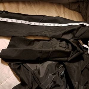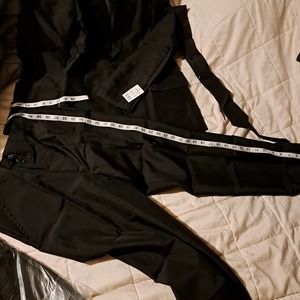 New in bag from Overstock - 3 in stock size Medium *** ready to wear SUIT = Pants, jacket and tie - UNISEX black shiny polyester suit - elastic strip allows more room in pants. SIZE SMALL MEN or MEDIUM TO LARGE WOMENS SUIT WOMEN APPX SIZE 9-10. THE LEG LENGTH IS 42 inches long pants from to to end of cuff. 35 INCHES WAIST. 26-inch long sleeve. Adjustable waist band allows for up to appx 38 waist.