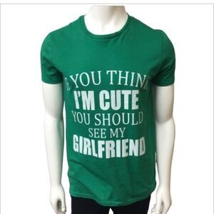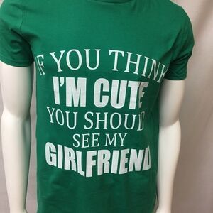 Great gag gift! This could go either way. Men could wear it and so could our friends in the LGBTQ community. The saying on the shirt is . . . "If you think I'm cute you should see my girlfriend." Tag says it is a men's size medium. Tags: Christmas, funny, unisex, gag gift, dirty Santa gift. A-13