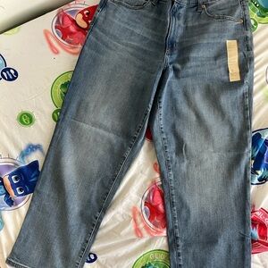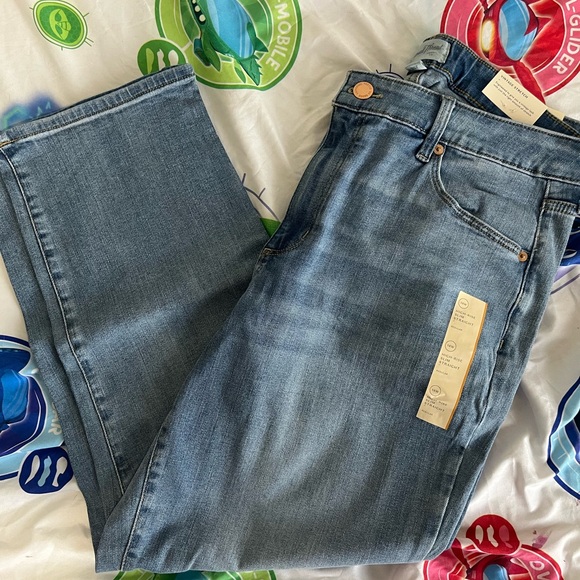These high rise slim straight (vintage stretch) jeans boast a classic blue hue and a timeless denim texture. The full-length design ensures a comfortable fit, making them perfect for everyday wear. Their subtle whiskering and fading add a touch of character to the versatile denim style.