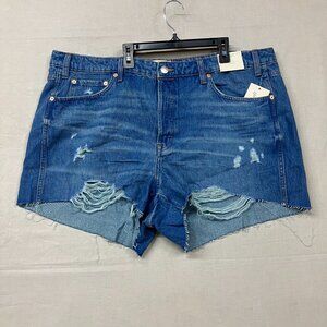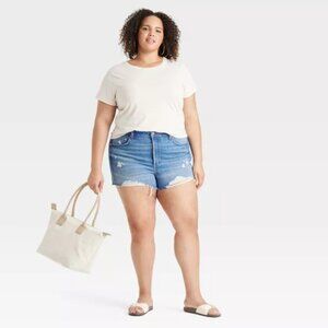 Universal Thread high-rise cutoff shorts, Women's size 18 blue denim shorts, Plus size raw hem jean shorts, High-waisted mini denim shorts, Universal Thread plus size shorts, Raw hem cutoff shorts for women, Blue jean mini shorts with pockets, Button fly high-rise denim shorts, Heavyweight cotton summer shorts, Classic 5-pocket high-rise shorts