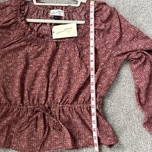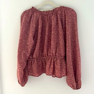 Elegant red blouse with a stylish design, perfect for any occasion. Cute ruffled neckline with a tie cinch waist and ruffle hem. Lightweight and perfect for spring/summer. Comes from a smoke/pet free home.