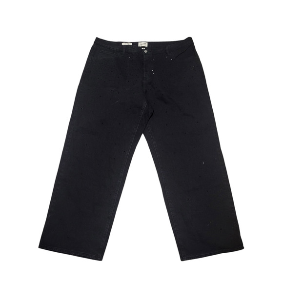 These trendy jeans feature a striking black color adorned with sequins, adding a touch of glam and sparkle to your wardrobe. The comfortable, stretchy fabric ensures a flattering fit, while the sequined detail offers a unique, eye-catching look. Perfect for dressing up any casual outfit or adding some sparkle to a night out, these jeans are a bold statement piece. Please note, this garment was obtained in a collection with sparkly items, so there are some sparkles on it. These will come off after washing. The jeans are new with tags and in excellent condition.