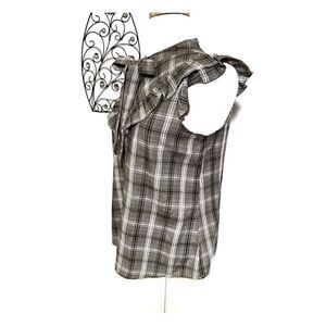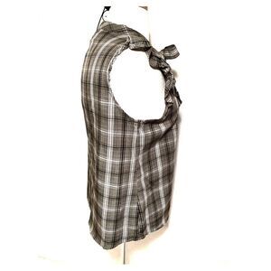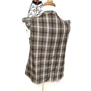 Cute green, white and black plaid button up top. Sleeveless with ruffles across shoulders and V’d across the front. Long sash at neckline. Measurements laying flat are;
