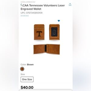 NWT University of TN Volunteers Vols Mens Wallet Folding Credit Card/DL Slot
