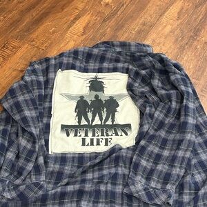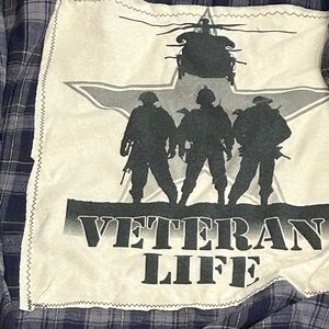 NWT UpCycled Graphic Flannel Veteran themed Graphic Flannel size Large