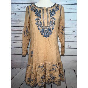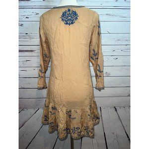 NWT Urban Mangoz Dress Medium Bohemian Boho Hippie Beige in color with embroidered blue detail throughout in a floral design. Ruffle bottom hem. Semi Sheer. 100% cotton Hand wash. Pit to end of sleeve 17", pit to pit 18", back bottom of collar to bottom of dress 33.5". Great new with tags condition makes a perfect gift for the career or casual business woman. Perfect for summer beach festival vacation. color is crayola Tumbleweed.