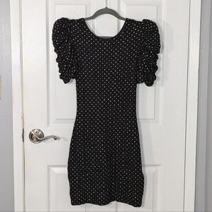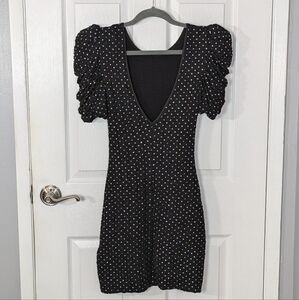 New, New With Tags, Women, Woman, Women's, Dress, Fun, Party, Cocktail, Low Back, Puff Sleeves, Mermaidcore, Taylor Swift Eras Tour, Sabrina Carpenter, Funky, Retro, Sparkly, Sparkles, Rhinestones, Embellished, Embellishments, Black, Grey, Gray, Short Sleeve, Bodycon, Stretchy, Stretch, UO, Urban Outfitters, Urban, Club, Clubbing, Dancing, Night Out, Girls Night, Size Small, Size S, Flattering, Fem, Feminine, Femme, Chappell Roan Style, Lined, Statement Sleeves, Ruching, Ruched Sleeves, Puffy Sleeves, Metallic, Event, Cocktail, Eye Catching, LBD, Little Black Dress, Mini Dress, Short, 80s Style, 80s Inspired, Polyester, Spandex, Hague Rhinestone Mini Dress, Polka Dots, Micro Dots