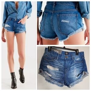 "Itty-bitty distressed denim short from Urban Outfitters. Made from a vintage wash twill in a low-rise construction + super short length. Topped with a button-zipper fly + 5-pocket detailing. Finished with frayed hems that can be rolled up or down."