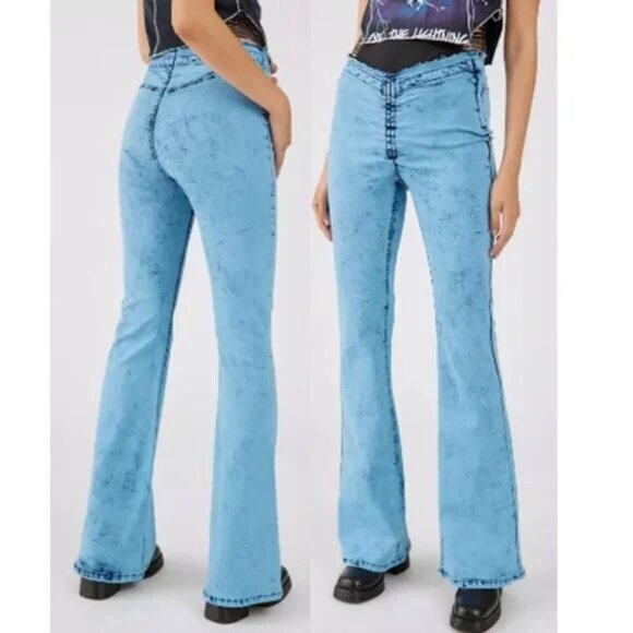 🦋 NWT 🌸 Urban Outfitters BDG Women's Ruched V-Front Dipped Flare BLUE Jeans 24