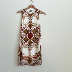 Sweetly printed sleeveless frock dress from modern boho brand, Ecote. In an easy pull-on trapeze silhouette adorned with allover floral print complete with a cut-out at the back and hook closure at the back of the neck. Rayon. Machine wash. Model in Orange multi is 5'10" and wearing size Medium. Measurements taken from size Medium. Chest: 46". Length: 33.5"