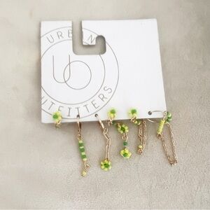 NWT Urban Outfitters Green Beaded 3 Mismatched Earrings Sets. Varying backs, green beaded designs, and all earrings are different styles. Gold hardware.