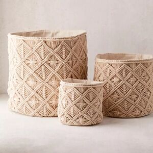 Perfect for storing blankets, magazines and trinkets out of sight, this macramé basket is so boho. Featuring a canvas lining with knotted macramé strands woven around outer in a trio of sizes made to fit your space just right. Available exclusively at Urban Outfitters.