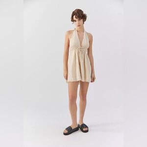 UO halter dress in a breezy linen blend. Cut with a plunging neckline and a flowy mini skirt with a raw hem. Finished with a cutout at the front and a low-cut back. Find it only at UO.
