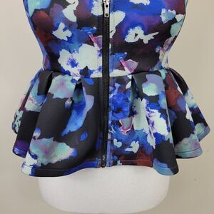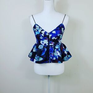 NWT Urban Outfitters Silence + Noise Floral Crop Top in a vibrant blue. This stylish crop top features a flattering peplum style with spaghetti straps and a ruffled hem for a feminine touch. Made from comfortable scuba fabric, it’s fully lined for a smooth fit. The front zip closure adds a modern edge to this floral piece, making it perfect for pairing with high-waisted jeans or skirts. A must-have for adding a playful yet chic vibe to your wardrobe!