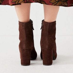Description:Give your modern look a ‘60s-inspired twist with these suede ankle boots. Square toe bootie cut above ankle with seamed construction and zipper at inner ankle, rendered in soft, dimensional suede. Propped on a covered block heel with grippy rubber coating to keep you strutting your stuff all night long. Only at Urban Outfitters.