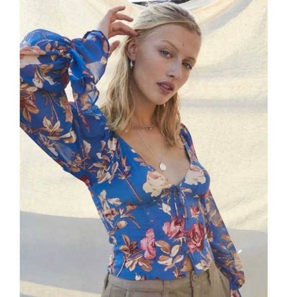 NWT Urban Outfitters Topanga Button Front Cropped Blue Floral Ruffle Blouse Top