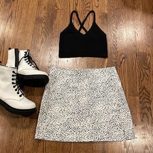 NWT Urban Outfitters white with black dots 98% cotton 2% elastase mini skirt. Waist 30” and length 15.5”. Zippered back with hook and eye closure. (Crop top and boots sold separately but can be bundled for a discount and shipping savings). Smoke free home.