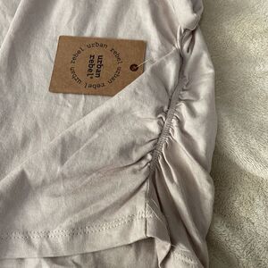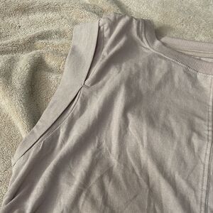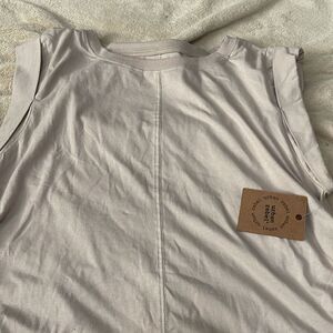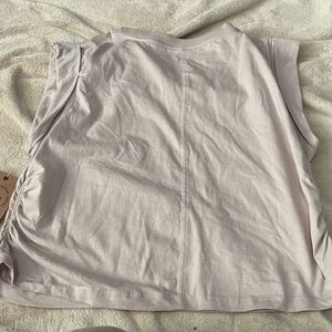 Beige, rolled and sewn muscle sleeves, cinched gathered side seams, front & back middle seam