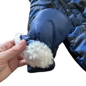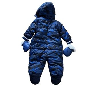 New with tags!! Urban Republic Blue Camo Faux Fur Lined Quilted Footie Snow Suit Sz 6 Months Quilted footie with faux fur lining is sure to keep your little one warm. Attached hood Long sleeves Detachable mittens Striped ribbed knit cuffs Front zipper Zipper garage Two chest button pockets Faux fur lining: Polyester Polyurethane coating Polyester Fill: Polyester Fur type: Faux Machine wash