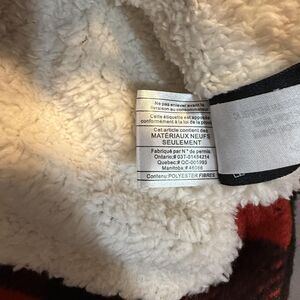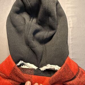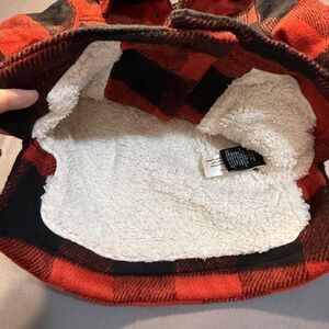 Color: Red and black check plaid exterior with white sherpa-style faux fur body lining and black hood exterior.