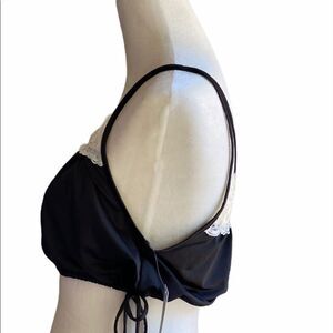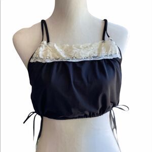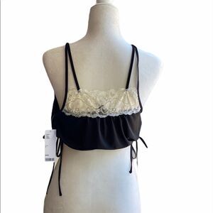 NWT Urban Outfitters Short + sweet cropped cami by Out From Under. Made from a satin-look fabric with a loose fit + adjustable side-tie closures at the cropped hem. Double spaghetti straps lead from the square neckline with lace panel detailing to the matching back. The item is in Black. Photos in white are sample. 90% Polyester 10% Spandex