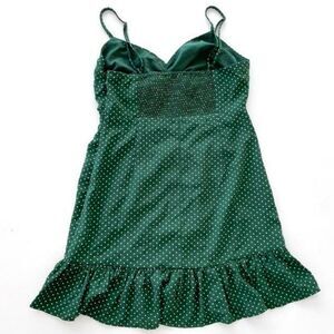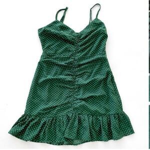 Retro-inspired mini dress from UO topped with an allover polka dot print. V-neck design, features ruched detailing at the cinched front and a ruffled mini-length hem. Complete with adjustable spaghetti straps and smocked panel at the back for a comfortable fit.