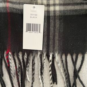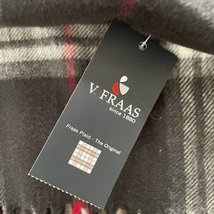 New with tags, V. Fraas Plaid Oblong Cold Weather Scarf in black white grey and red plaid. Warmth Factor: Midweight