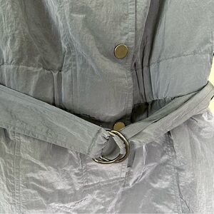 • Covered elastic waistband with optional self-belt, Gunmetal-tone hardware and snap placket, Collared neckline and notched lapels, Short sleeves with fixed cuffs, Slant hip and welt back pocket