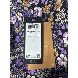 NWT VERO MODA Floral Ruched Mini Dress Black Purple V-Neck S