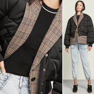 The Larkin puffer jacket from Veronica Beard is a hybrid piece that's designed with a Glencheck blazer layered underneath. It merges sharp tailoring with casual outerwear to make a statement.
