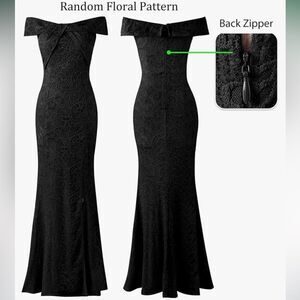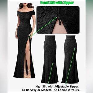 NWT • Style: Look stunning in this sexy off the shoulder neckline gown with pleated front twist knot and floral lace stretchy fabric details. It features a maxi length, a concealed back zipper, and a front High slit with adjustable zipper allows you to show as much leg as you feel comfortable with.