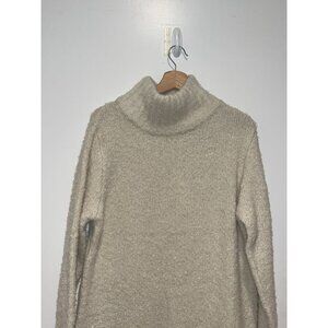 Soft cream knit sweater with cozy turtleneck and playful fringe hem. Ideal for chilly days, blending comfort with style.