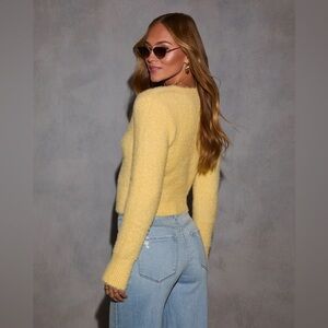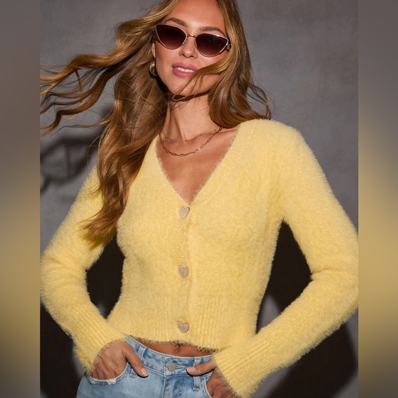 NWT VICI Yellow Fuzzy Knit Pearl Heart Button Front Cardigan- Size Small