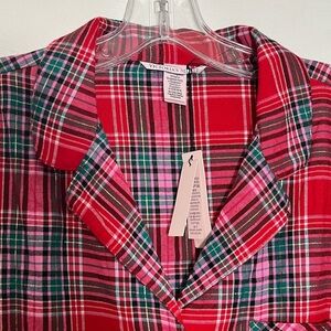 New with tag. No signs of wear, or any stains. Very comfortable material. Red, green, and pink plaid with gold threading. Button down style with long sleeves. 54% cotton, 44% modal, 2% other fibers.