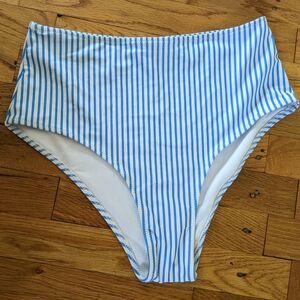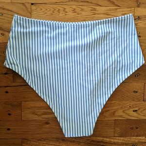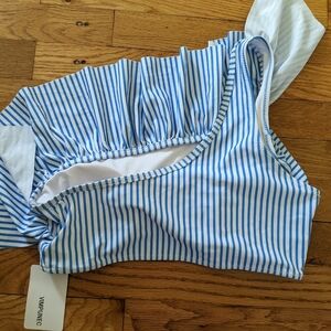 Blue and white striped bikini with one strap, ruffle top and high waisted bottoms. Removable padded cups included in the top.