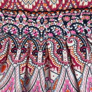 This dress features a stunning geometric print in shades of pink and blue, with a flattering fit & flare silhouette. The dress is made of a comfortable knit fabric, with a sleeveless design and V-neckline. It also has a convenient zipper closure and pockets for added functionality. This dress is perfect for any occasion, whether it's a career event or a party. It is machine washable and easy to care for.