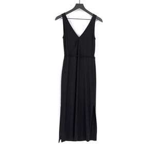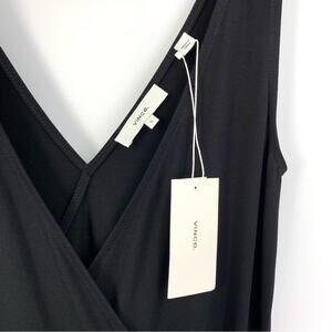 New With Tags Vince V Neck Jersey Wrap Midi Dress in black. Fixed tank straps, v neck in the front and back, wrap style. Interior snap closures to keep shape, interior drawstring, and loop for exterior hole for tie to loop through. Midi length with a slit up the side. Bouncy and soft! Great condition!
