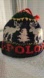 Warm knit hat featuring moose and tree pattern. Includes ear flaps and tassel. Ideal for cold weather.