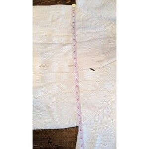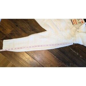 This is a vintage Mary Lewis cardigan sweater for women, made for Sears in Japan. It is in a size 42 (equivalent to a Large) and made of white acrylic material. The sweater has an Art Deco look and is new with tags. The chest size is 18.5 inches from armpit to armpit and the shoulder to hem measurement is 24.5 inches.