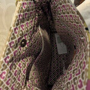Green, white, & Lavender. 14x12x5" 11" drop. 2 exteriors pockets (1 zip), 4 interior pockets (1 zip). magnetic snap closure.