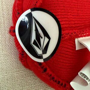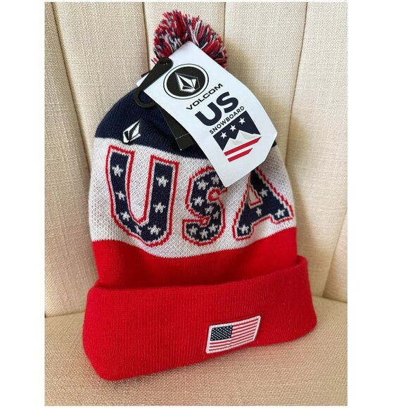 NWT VOLCOM logo USA roll over BEANIE hat with pom US snowboard new cap red blue