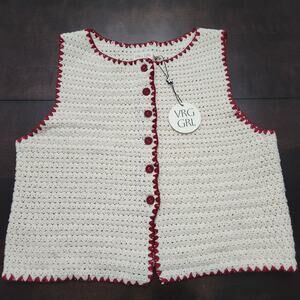 New with tags VRG GRL Stella Knit Vest and Pants Set. Knit vest with red accents and extra button in size Medium. Knit pants with elastic waist and red accent hem in size Large.