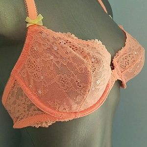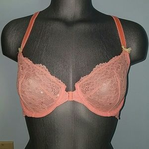 NWT VS Pink Dream Angels Unlined Demi Racerback Bra. The halter portion is very stretchy and included a ruffle detailing. The bra is also a front closure bra.