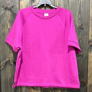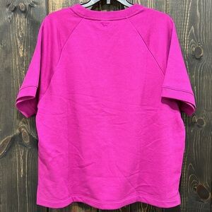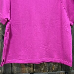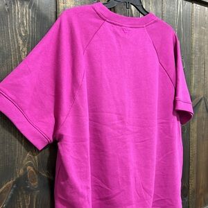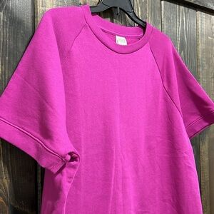 New with tags. Victoria's Secret PINK line fleece top. Size large. Purple. Short sleeves. Crewneck. Soft & cozy. Stretch material. Slightly cropped length. Relaxed / boxy fit. Stylish enough to wear out but comfy enough to lounge in. Logo on back.